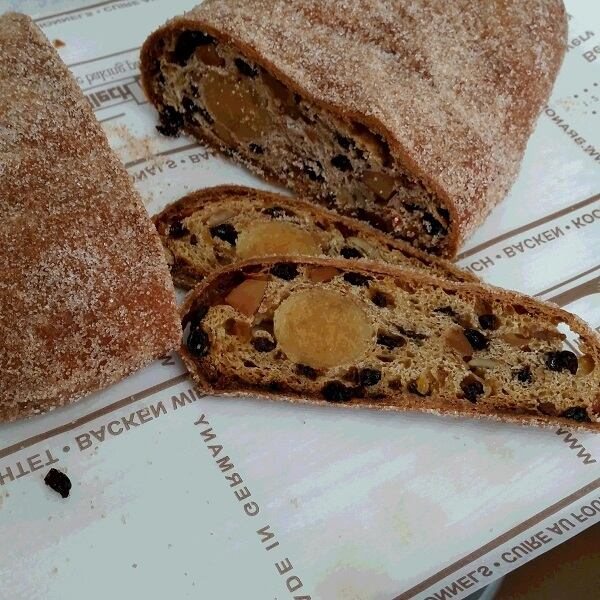 原材料名:小麦粉(国内製造)、ローマジパン、レーズン、バター、牛乳、柚子ピール、セミドライアプリコット、セミドライイチジク、アーモンド、クルミ、パンプキンシード、グラニュー糖、ドライイースト、洋酒、塩、シナモン、ミックススパイス(一部に小麦粉、乳成分含む)